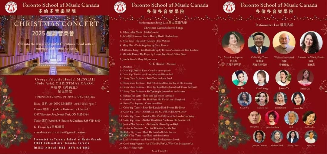 2025年12月20日晚,多伦多音乐学院在著名的天道神学院大教堂(Tyndale University Chapel)隆重举行圣诞音乐会。音乐会由多伦多音乐学院乐团现场伴奏,是一场兼具学术水准与艺术感染力的高规格音乐盛宴。