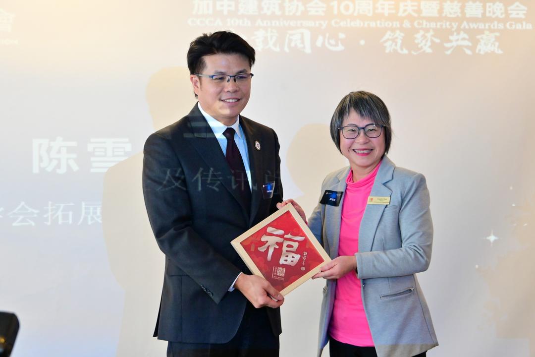 加中建筑协会十年以来积极提升行业,回馈社區,十年庆典晚会亦将特别为加拿大知名慈善机构孟尝会筹集善款。著名钻石商 LoveOnly 特别捐赠价值五万元加币的钻石,用于当晚的慈善抽獎环节,孟尝会拓展及传讯总监陈雪兰女士在新闻发布会上高度赞扬加中协会理事企业宏丰门窗和Airtree 淨水系統在参与万錦孟尝閣建造的专业施工,并向Alex 會長贈送了福字墨宝。
